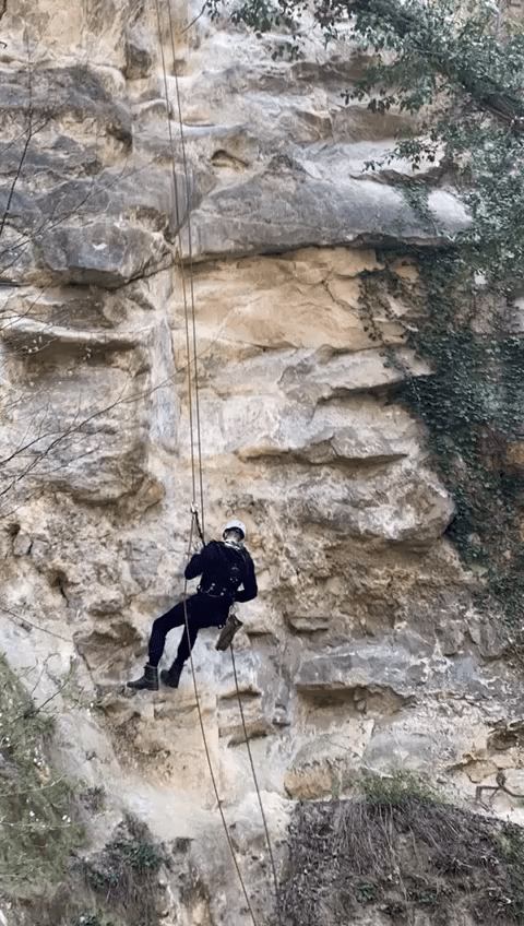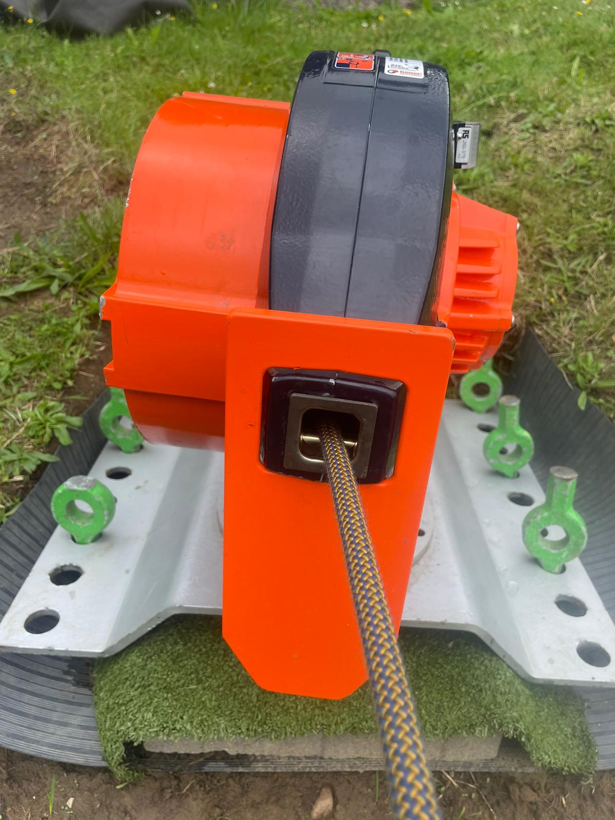 2 Op het dikke touw ( 24mm ) zit een nieuw remblok ( foto links boven ) zodat wij de tokkelaar een nóg zachtere landing kunnen bezorgen.
