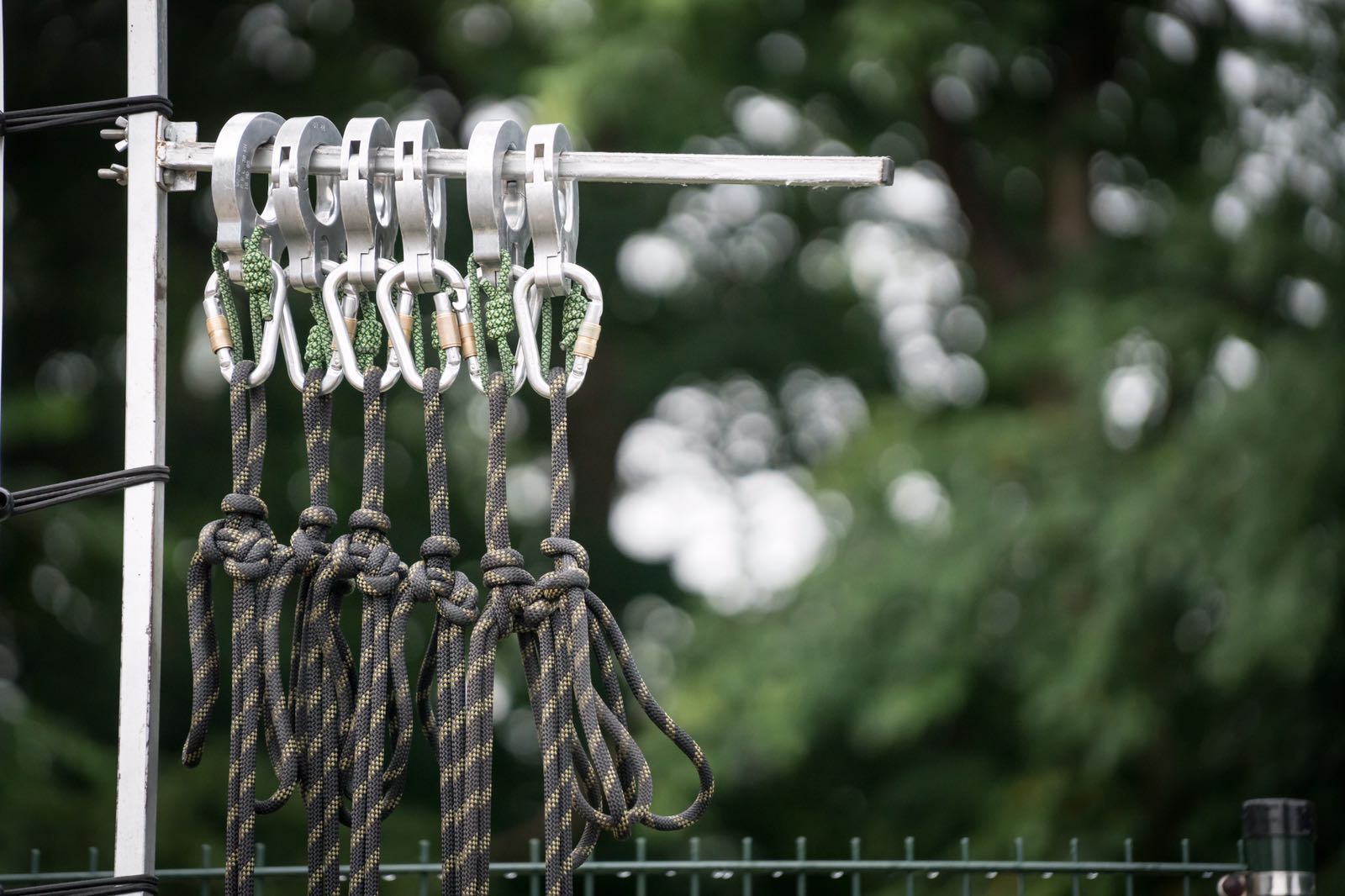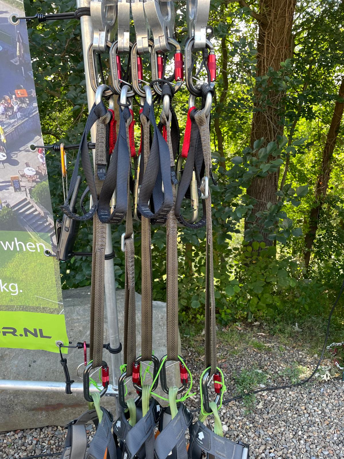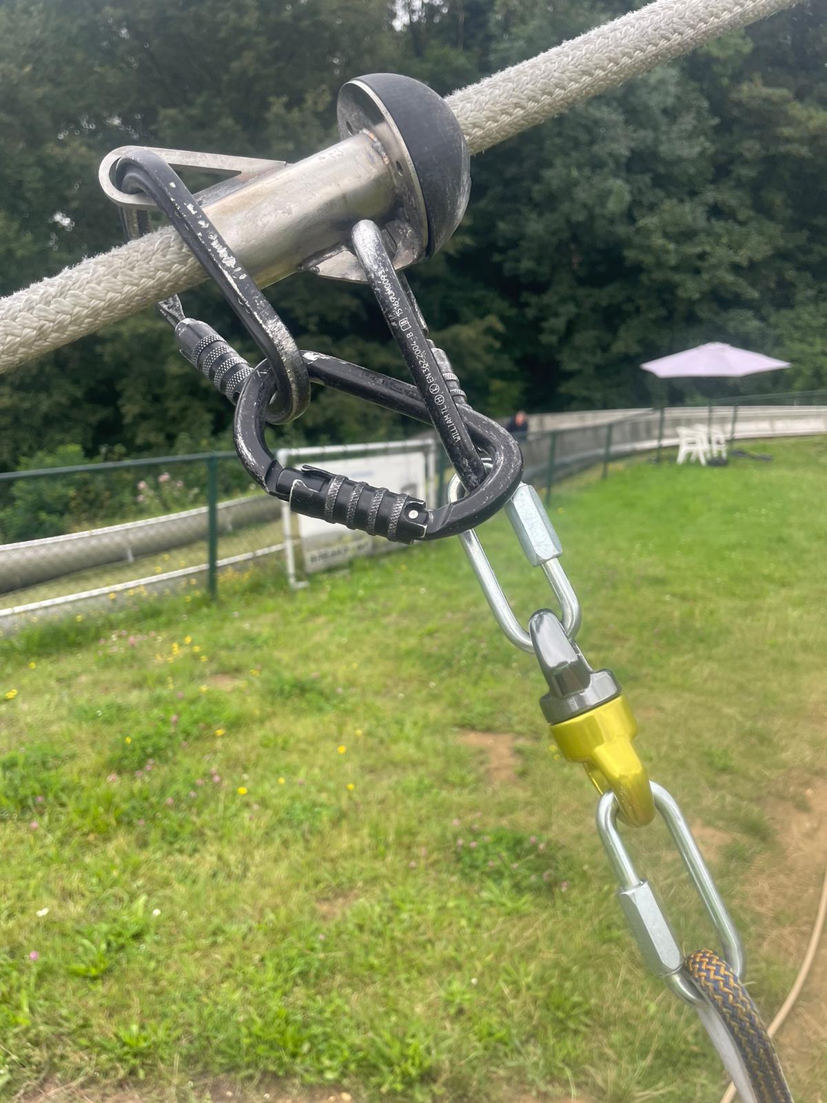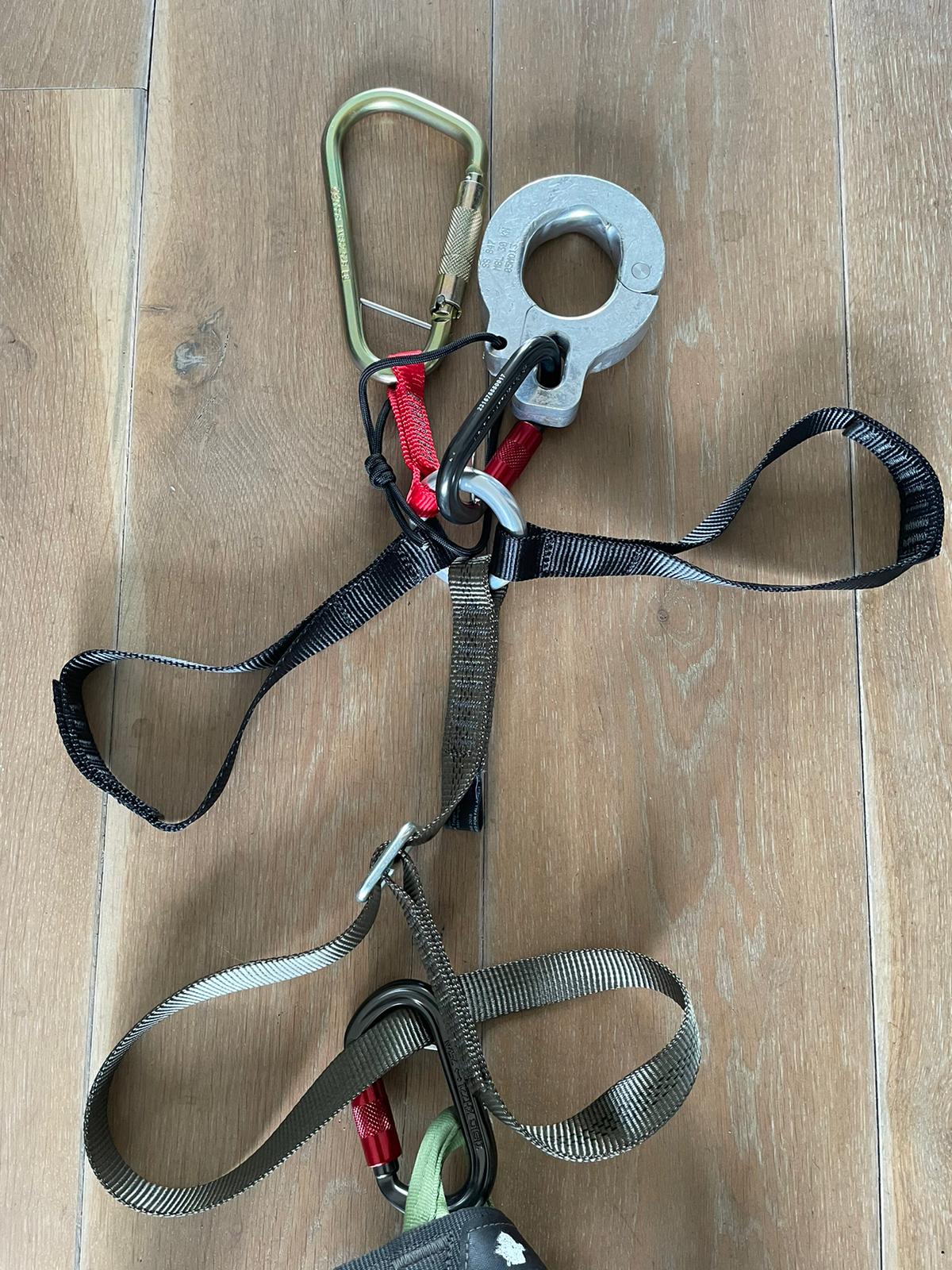 3 Het tokkelsamenstel ( foto’s beneden ) is veel veiliger geworden. Een tweede extra haak wordt ook op de lijn gezet als back-up. Alle onderdelen zijn van gecertificeerde bandlussen die aangepast kunnen worden aan de lengte van de tokkelaar. Daardoor kom je als het ware in de veiligheidsgordel te zitten i.p.v. aan je polsen te hangen. Dit biedt dus ook voor iedereen met een arm- en/of schouderblessure de mogelijkheid om te tokkelen.