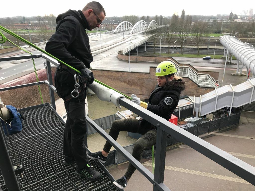 Het belangrijk is om de haak niet vast te pakken aangezien deze heet kan zijn van de wrijving die tijdens de afdaling is ontstaan.