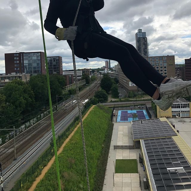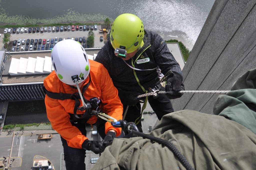 Abseilen is het afdalen aan een touw in verticale lijn. Het abseilen is te verdelen in een wandafdaling waarbij je met je voeten tegen een wand naar beneden kunt lopen of een zogenaamde vrije afdaling; je zet je niet af tegen een wand, maar hangt helemaal vrij aan een touw met vele meters lucht onder je voeten! Je wordt altijd eerst op een veilige plek vast gemaakt door de instructeur voordat je over de reling gaat en in het touw moet gaan hangen. De rechter hand is je eerste veiligheid. Beneden staat nog een instructeur die je beveiligd mocht je de rechter hand loslaten. Deze trekt dan het afdaal touw strak zodat je blijft hangen en niet naar beneden komt. Hierna stap je over de balustrade om zelf te bepalen hoe snel je weer met beide benen op de grond staat. Onderweg kun je genieten van het uitzicht.